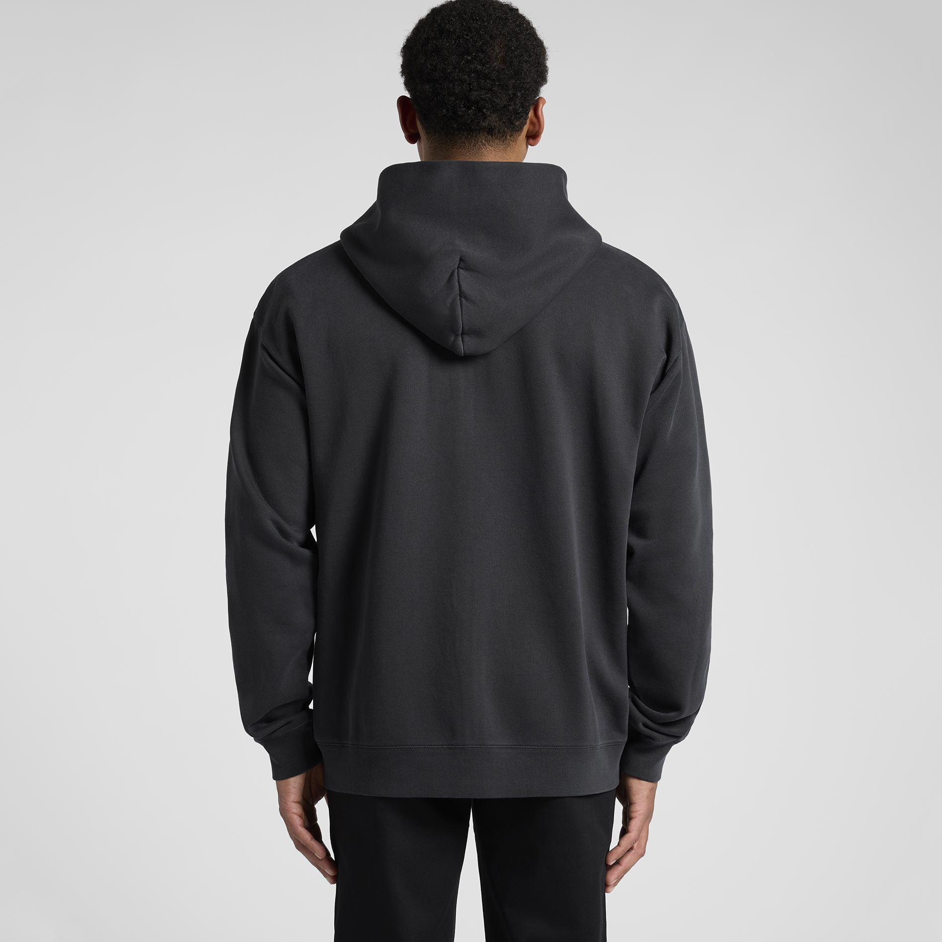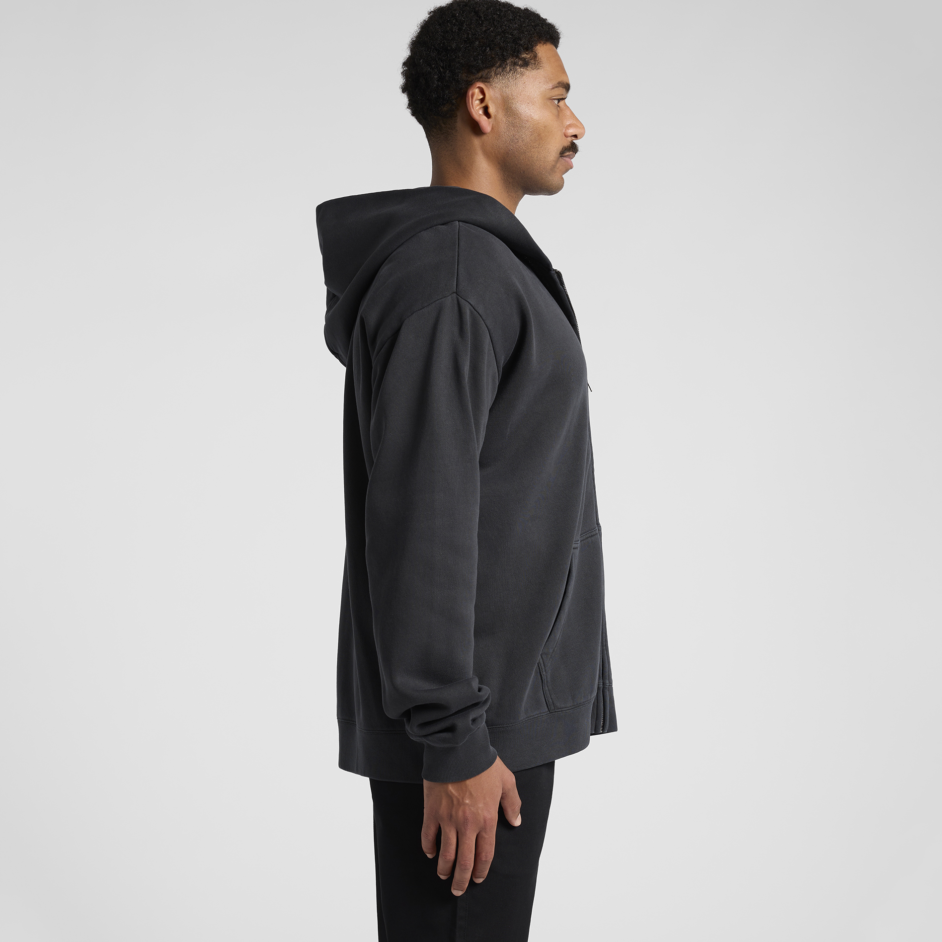 Garment dyed, zip hood, drop shoulder, kangaroo pocket, self-fabric lined hood, no drawcord, SBS two-way zip, sleeve cuff ribbing, CVC fleece, preshrunk to minimise shrinkage
